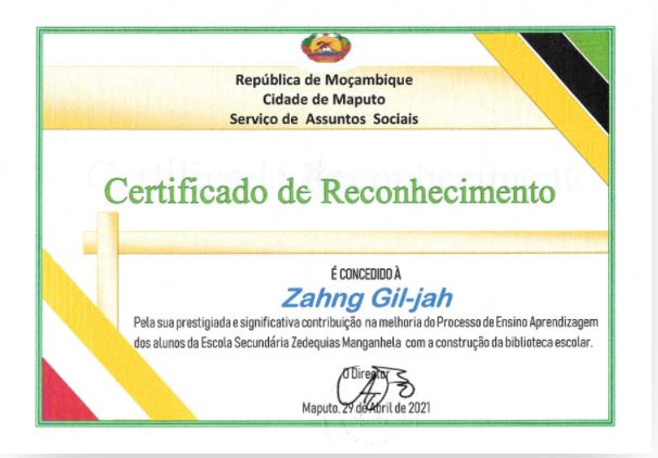 국제위러브유운동본부(회장 장길자)-모잠비크 마푸투시 사회복지청장 인증서착한일 2022. 2. 17. 12:01