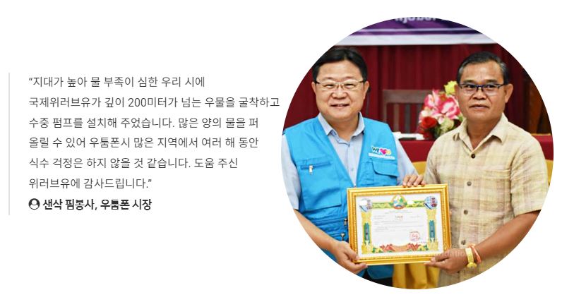 고통받고 있지요. 지구촌 이웃들을 위해 위러브유는 물펌프 및 물탱크,
