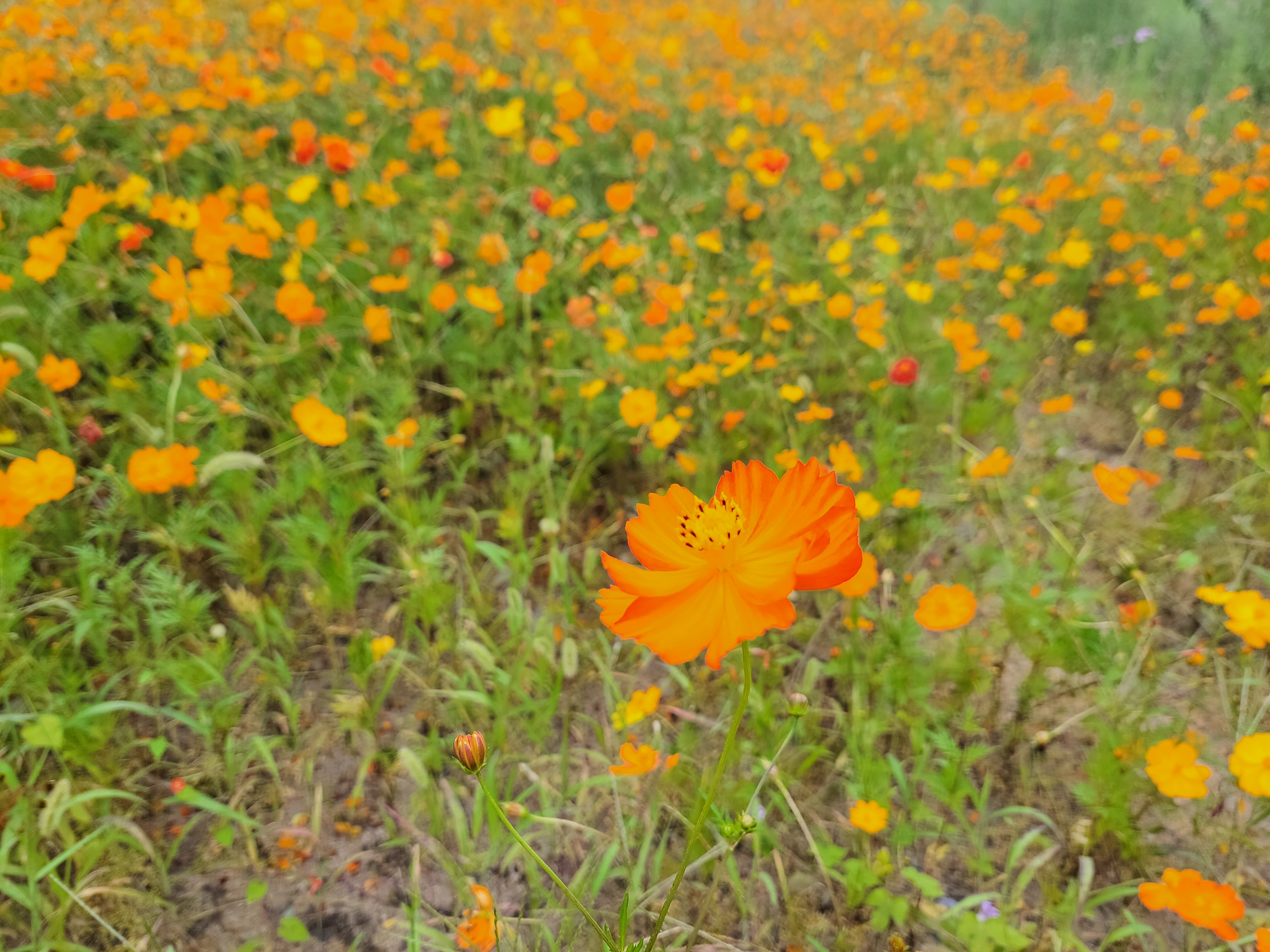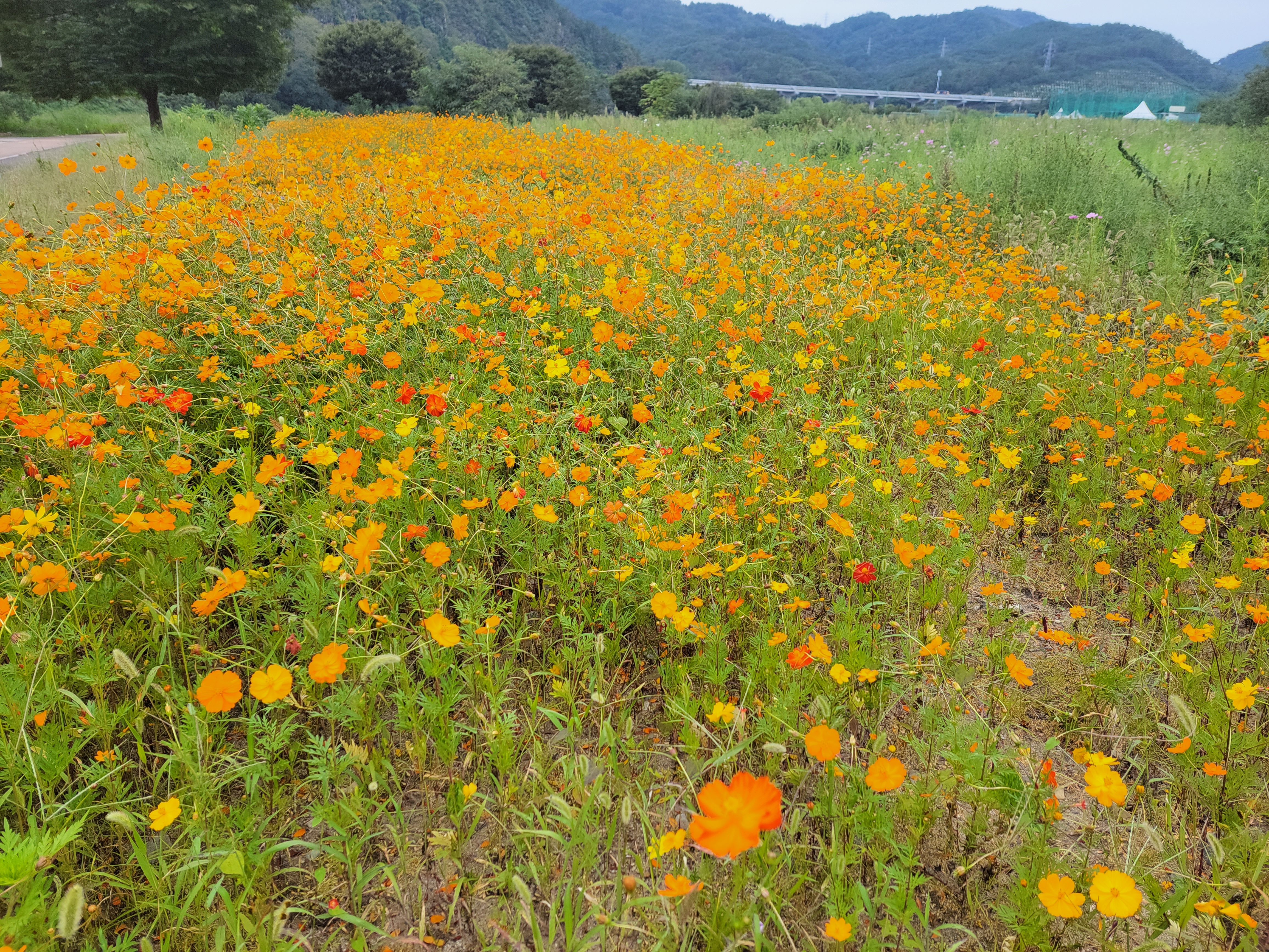한무리로 피어 있는 주황빛 코스모스가