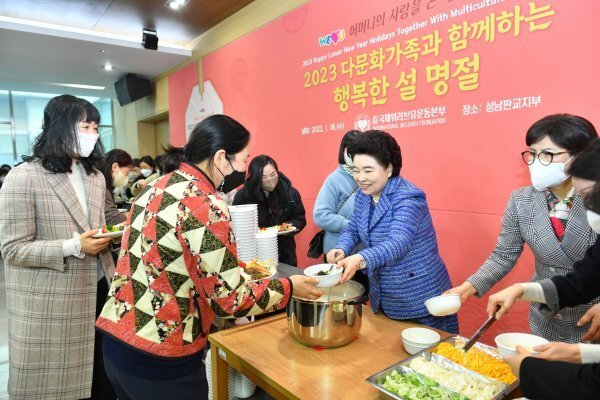 장길자 국제위러브유운동본부 회장이 다문화가족들에게 떡국을 담아주며 덕담을 전하고 있다. 식사 후에는 윷놀이, 제기차기, 투호던지기, 달고나만들기,
